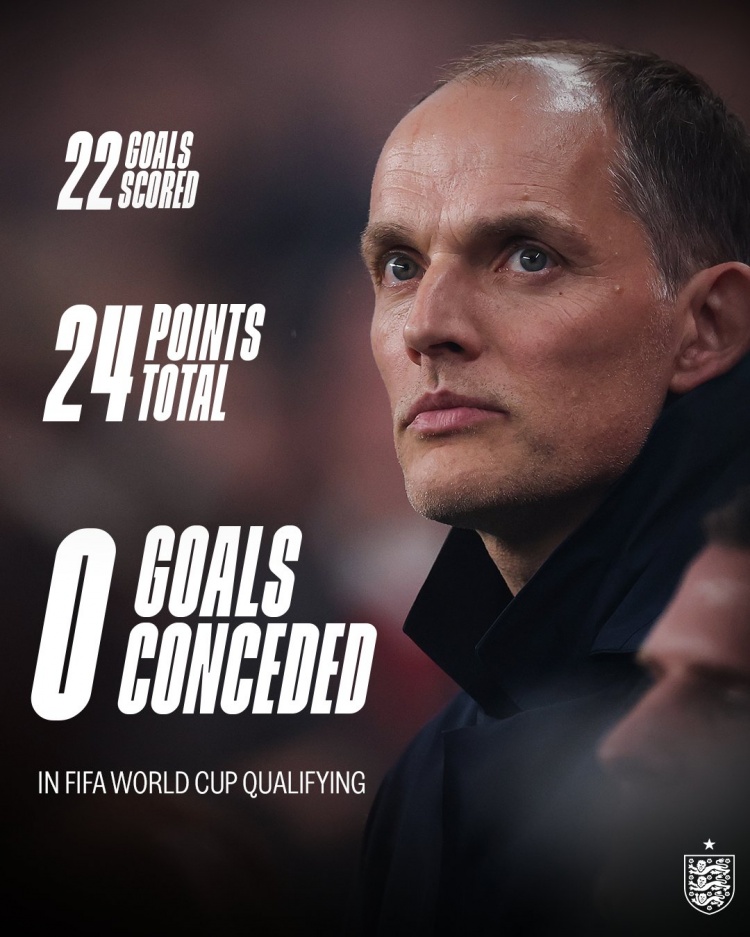 英格兰队官方社媒晒出球队世初赛战绩海报,英格兰队本届欧洲世初赛8战全胜,拿满24分,打进22球丢0球。