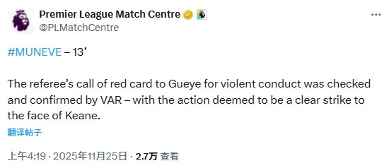 英超官方给出评释:“主裁判认定盖耶践诺暴力举止并出示红牌的判罚,经VAR时间核查证据,该行动被判定为对基恩面部的显豁击打行动。”