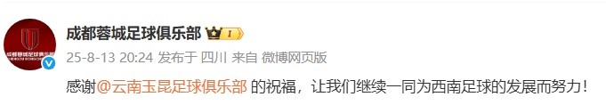 成皆蓉城官方转发并恢复:感谢云南玉昆足球俱乐部的道喜,让咱们不时一同为西南足球的发展而力争!