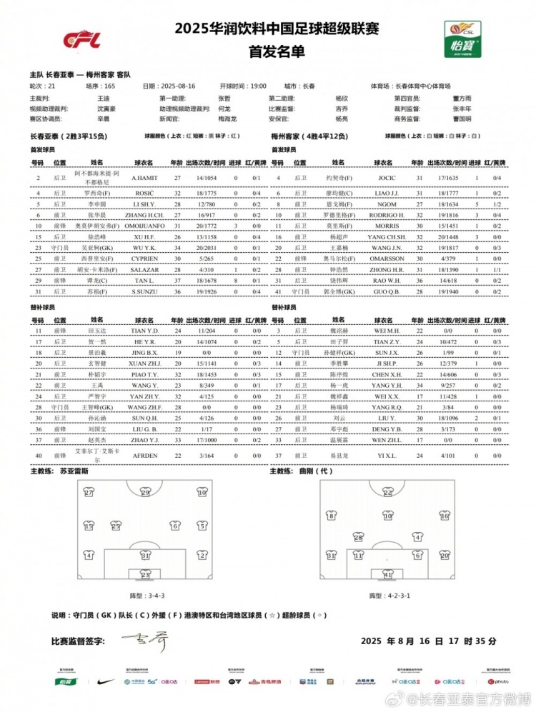长春亚泰vs梅州客家首发出炉,为长春咱们沿路走动