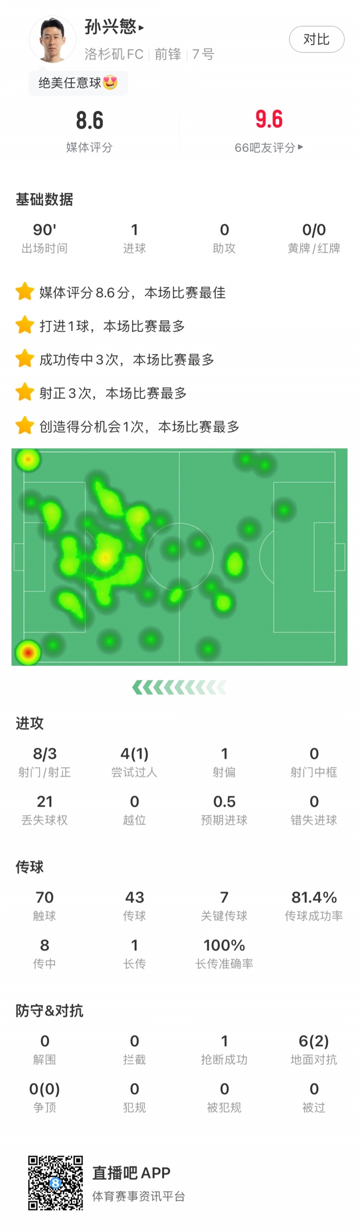 08月24日讯 好意思职联洛杉矶FC1-1战平达拉斯FC,孙兴慜纵情球破门打入MLS首个进球。此役孙兴慜多项数据全场最高,8射3正,7次舛误传球。