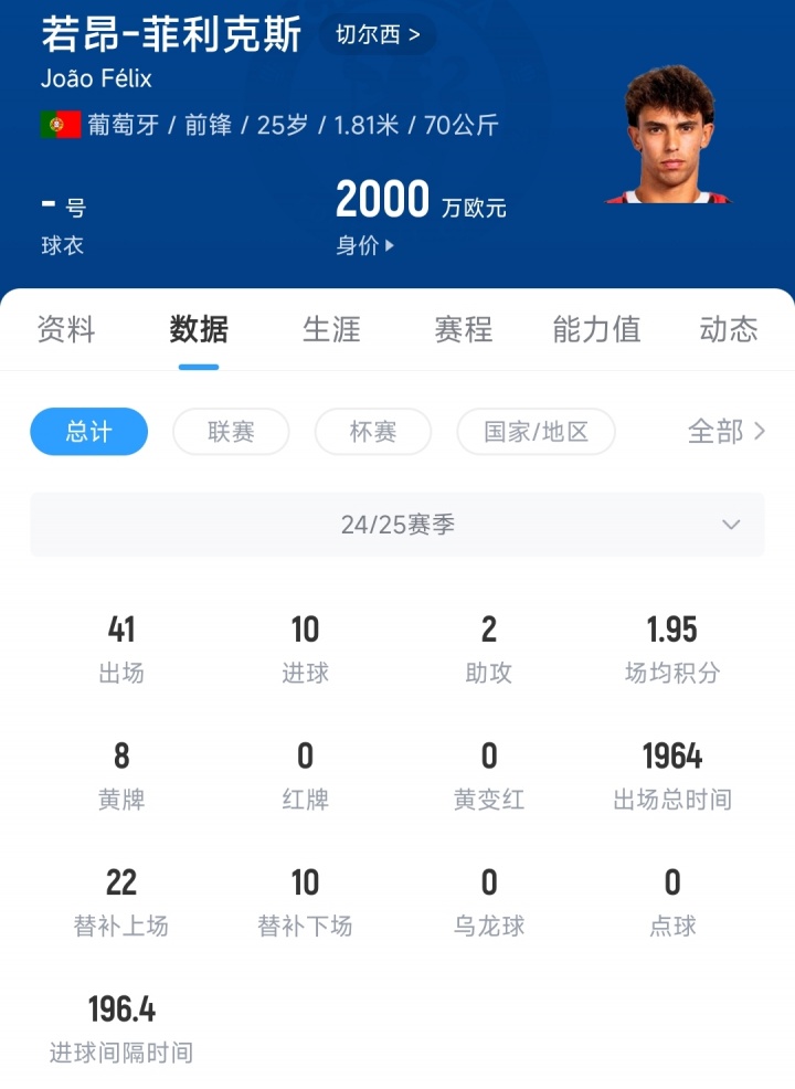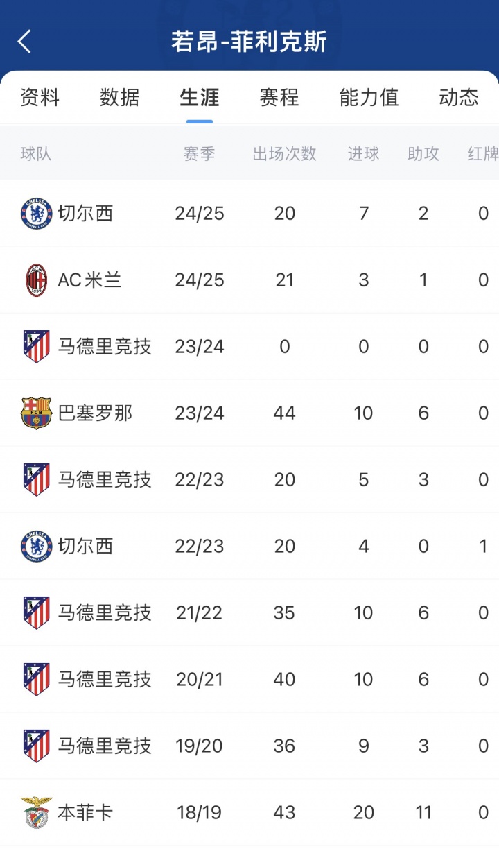 2023年1月,菲利克斯租赁加盟切尔西,开启了我方的流浪生计。两年间菲利克斯先后曲折马竞、巴萨、切尔西、AC米兰4支球队,但在每支球队遵守王人没能向上半年,如今他远走沙特加盟利雅得得胜。