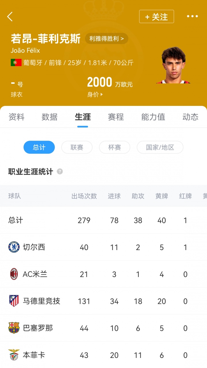 菲利克斯也就此完成了葡超、西甲、英超、意甲和沙特联的速通。
