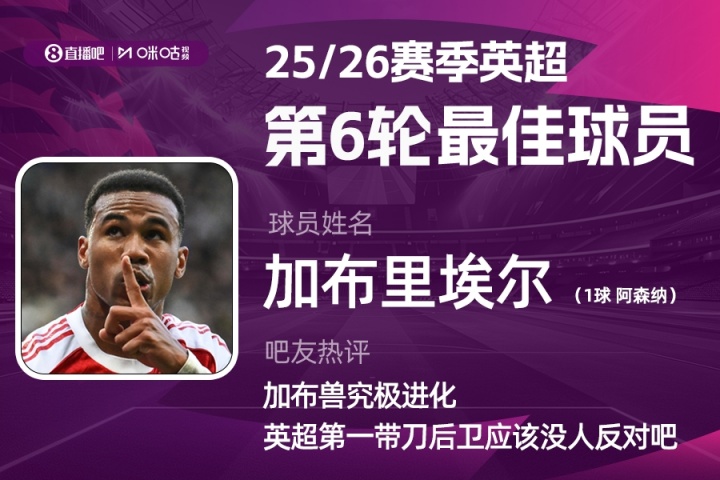 2025-2026赛季英超火热进行中,和咪咕体育纠合发起每轮英超最好球员评比行径!第六轮评比成果结出炉,加布里埃尔头球绝杀,匡助阿森纳2-1降服纽卡斯尔,赢得吧友8万票的救援,力压哈兰德当选 【X咪咕体育英超第6轮最好球员】!