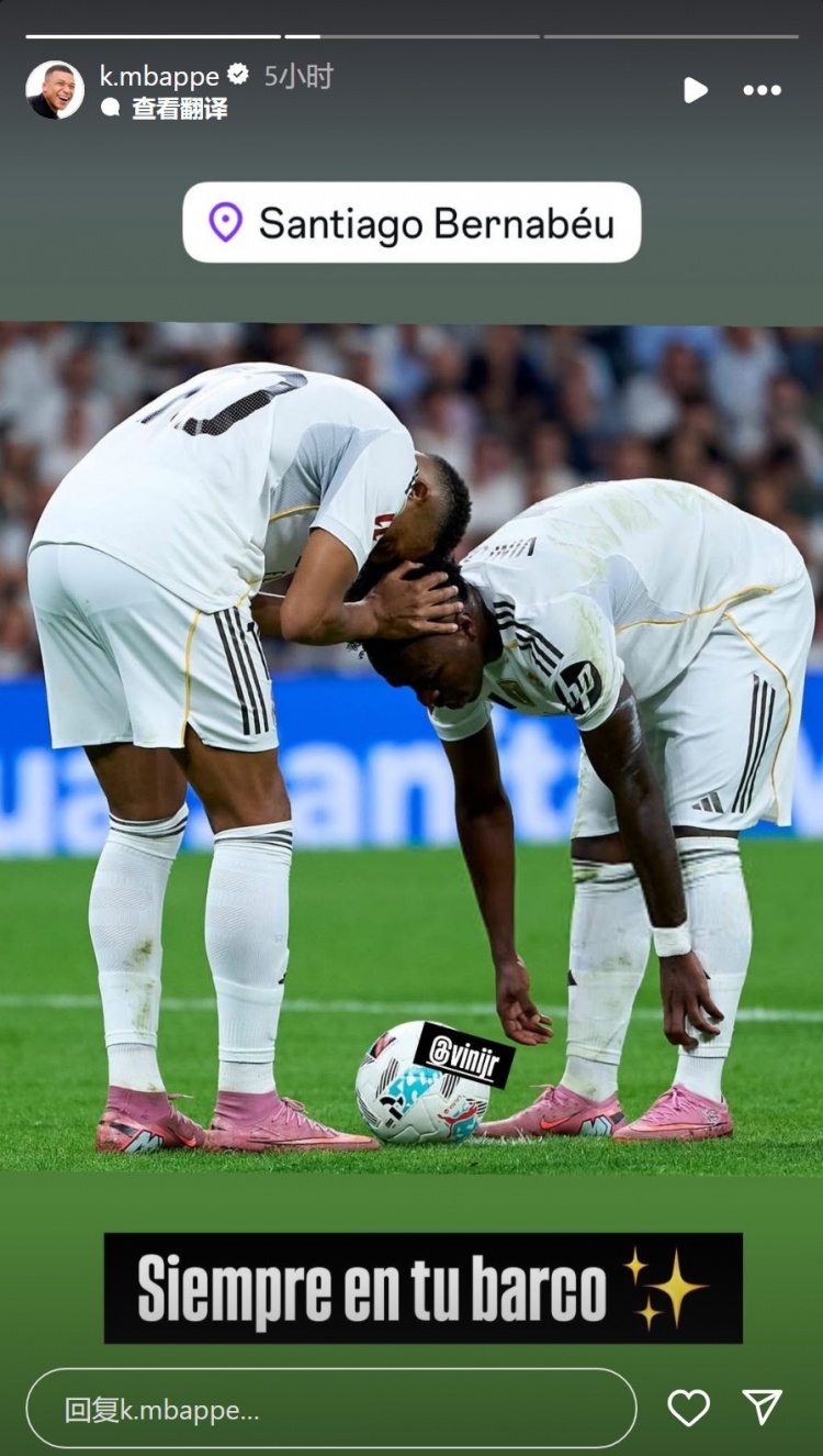 姆巴佩社媒晒出与维尼修斯的合照,配文:“永恒与你同在(永恒此心耿耿)。”