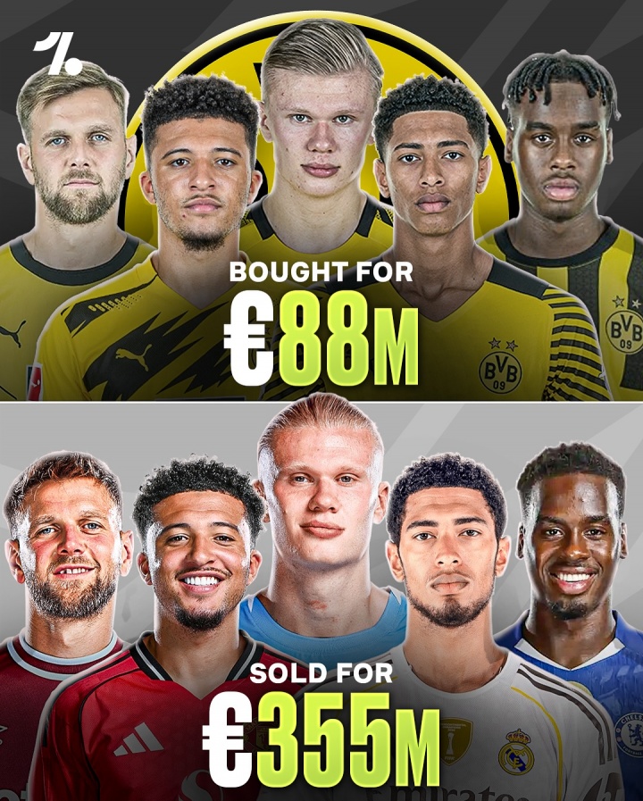 10月15日讯 Onefootball列出了连年来多特蒙德在转会阛阓上的一系列优秀操作,破钞8800万欧元签下哈兰德、桑乔、贝林厄姆等5名球员,并以策画3.55亿欧元将他们出售。