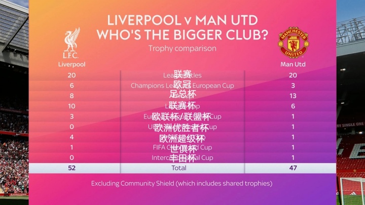 冠军总额方面,利物浦52座,曼联47座。