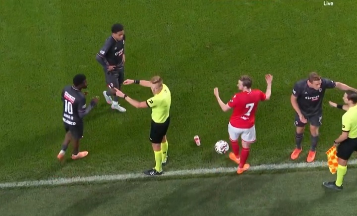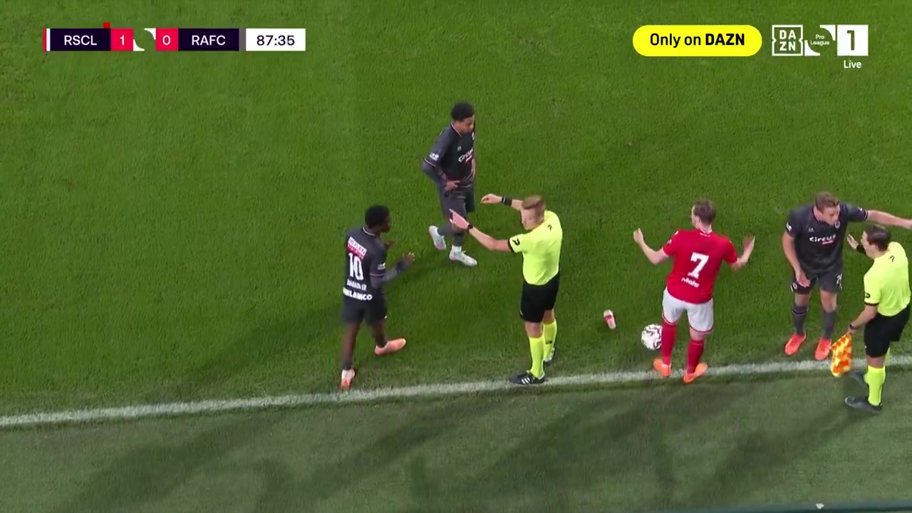 那时,主裁判站在边线上,默示球员们隔离边裁,罢手对评判员判罚的抗议。而看台上的球迷向场内扔出了水杯,击中了主裁的背部和圭臬列日球员的手臂。主裁判坐窝吹哨默示比赛就此取消,两边球员齐对这一判罚感到颓丧。