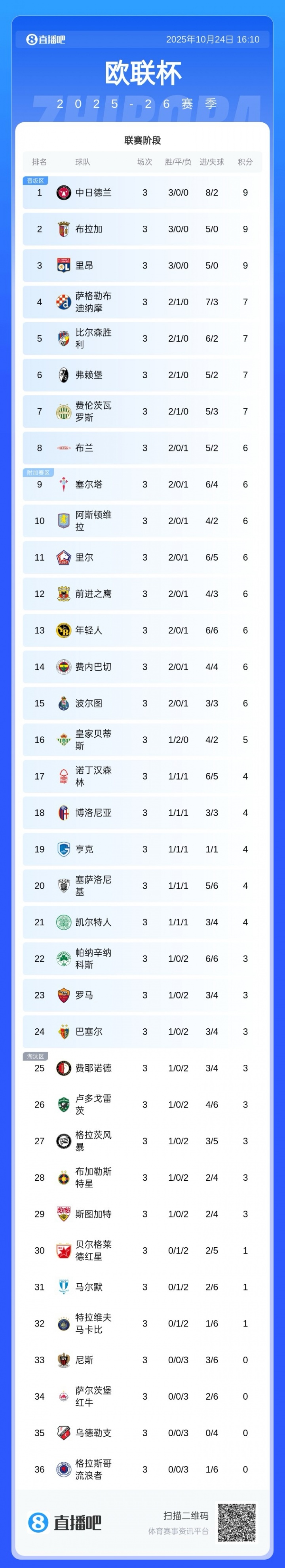 现在欧联杯联赛阶段3轮战罢,流浪者积0分在36队里垫底,处境沉重。