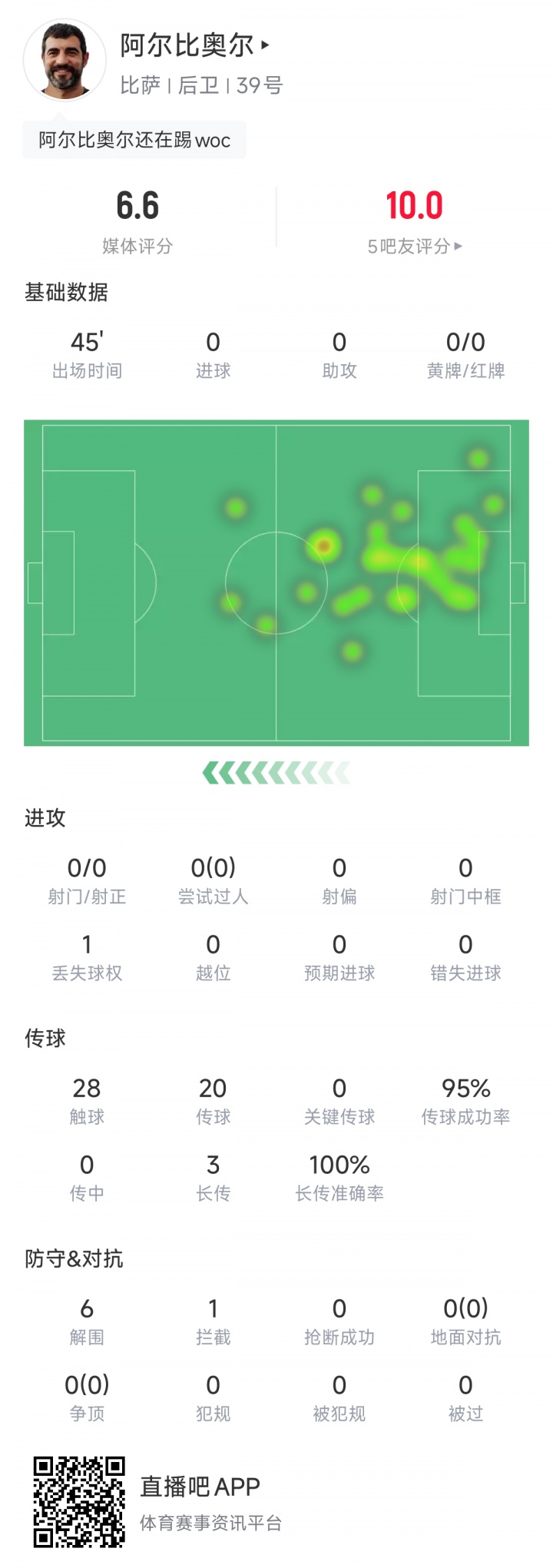 40岁的阿尔比奥尔本场没能打满全场,他不才半场被换下。这位已经的西班牙国脚孝顺6突围1阻挠0被过的驻扎数据,28次触球仅有1次丢球权。