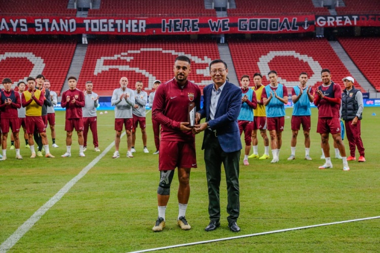 今天的官方磨练启动前,俱乐部为两位球员举行授奖庆典。俱乐部总司理沙良昌为莱昂纳多颁发第25轮最好球员奖杯,为李帅支持百场缅思球衣。