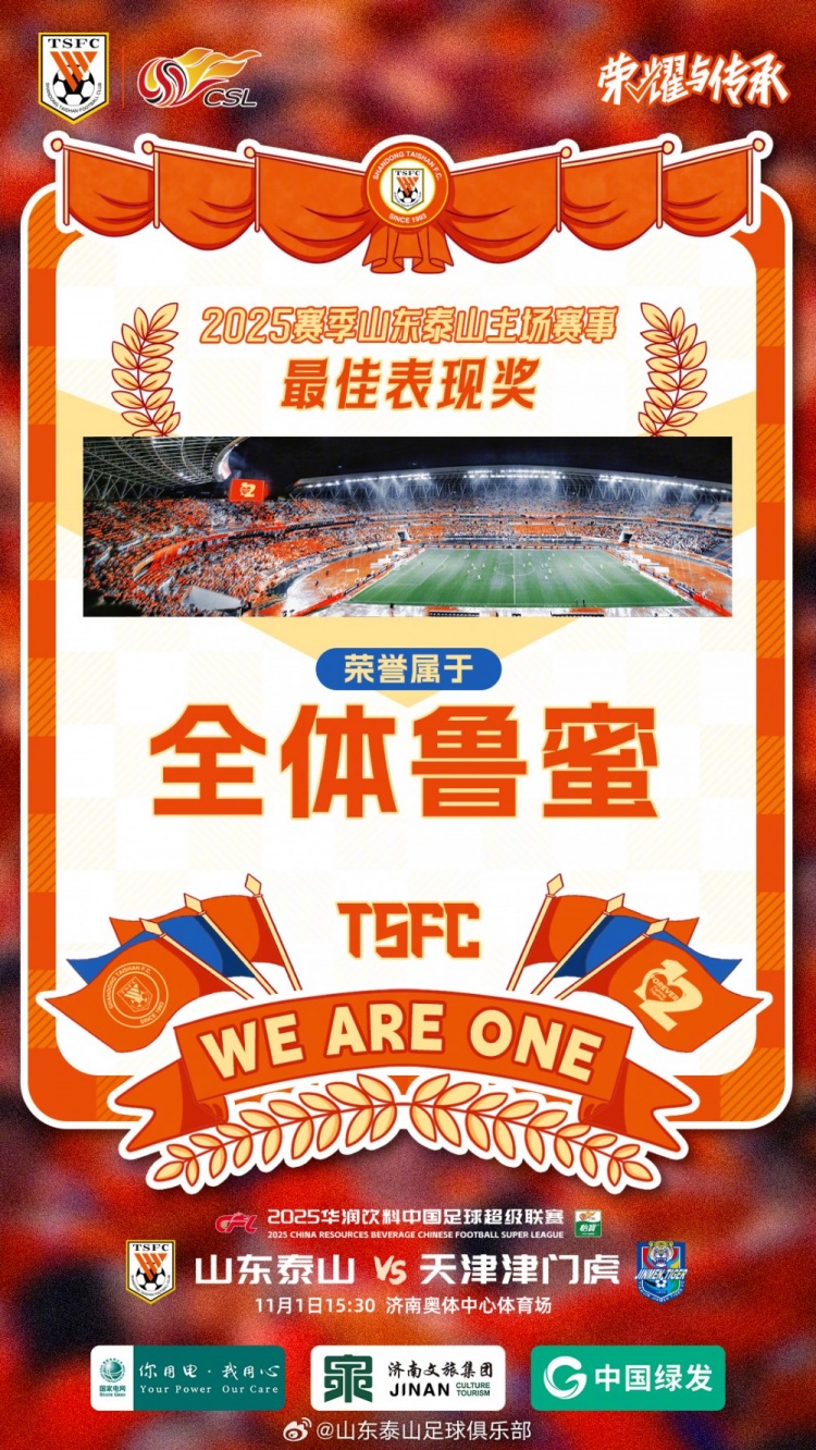 在本赛季主场收官战前,山东泰山俱乐部官方发布海报,将本赛季山东泰山主场赛事最好解析奖给以整体鲁蜜。