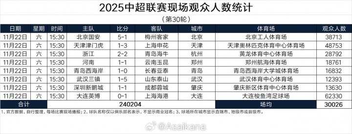 2025中超联赛现场不雅世东说念主数统计(第30轮)
