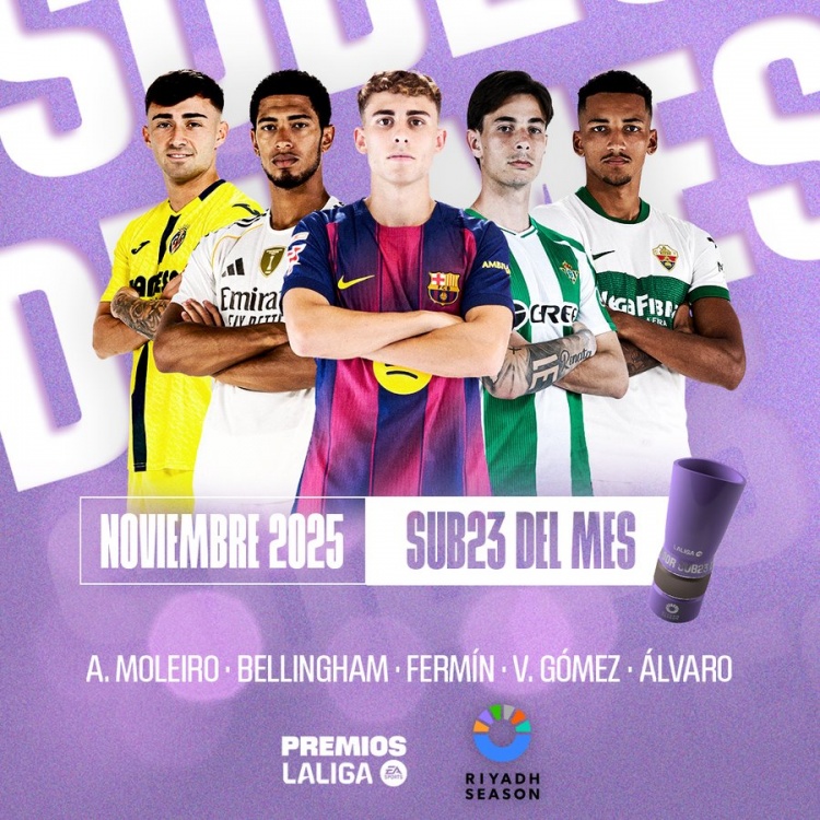 11月27日讯 西甲官方公布联赛11月最好U23球员候选,费尔明、贝林厄姆在列。