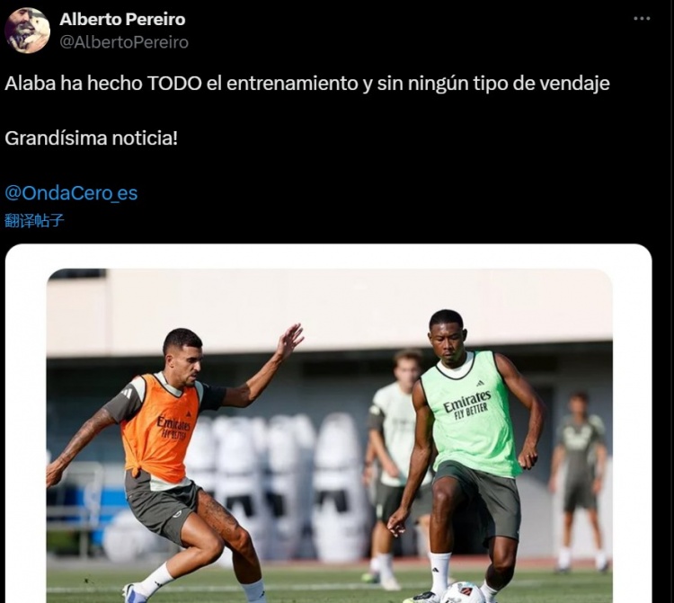 8月5日讯 据记者Alberto Pereiro报谈称,阿拉巴圆善地进入了皇马全队的合练,况且莫得缠任何绷带。