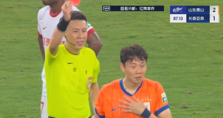08月09日讯 泰山vs亚泰第88分钟,高准翼边路亮鞋底铲到玄智健脚踝,主裁判看过VAR后改判直红将高准翼罚下!