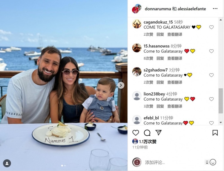 多纳鲁马社媒晒出与家东谈主共度巧妙时光的相片,餐盘上写有“Numero 1”(Number 1)字样,配文:“我的全全国。”好多球迷在多纳鲁马的动态底下留言刷屏,但愿他能加盟加拉塔萨雷。