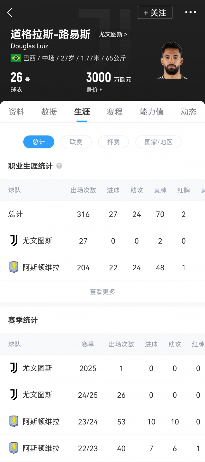谈格拉斯-路易斯前年夏窗以5150万欧元的转会费从维拉加盟尤文,但扫数这个词2024/25赛季,谈格拉斯-路易斯只出场26次,莫得孝敬任何进球或助攻。