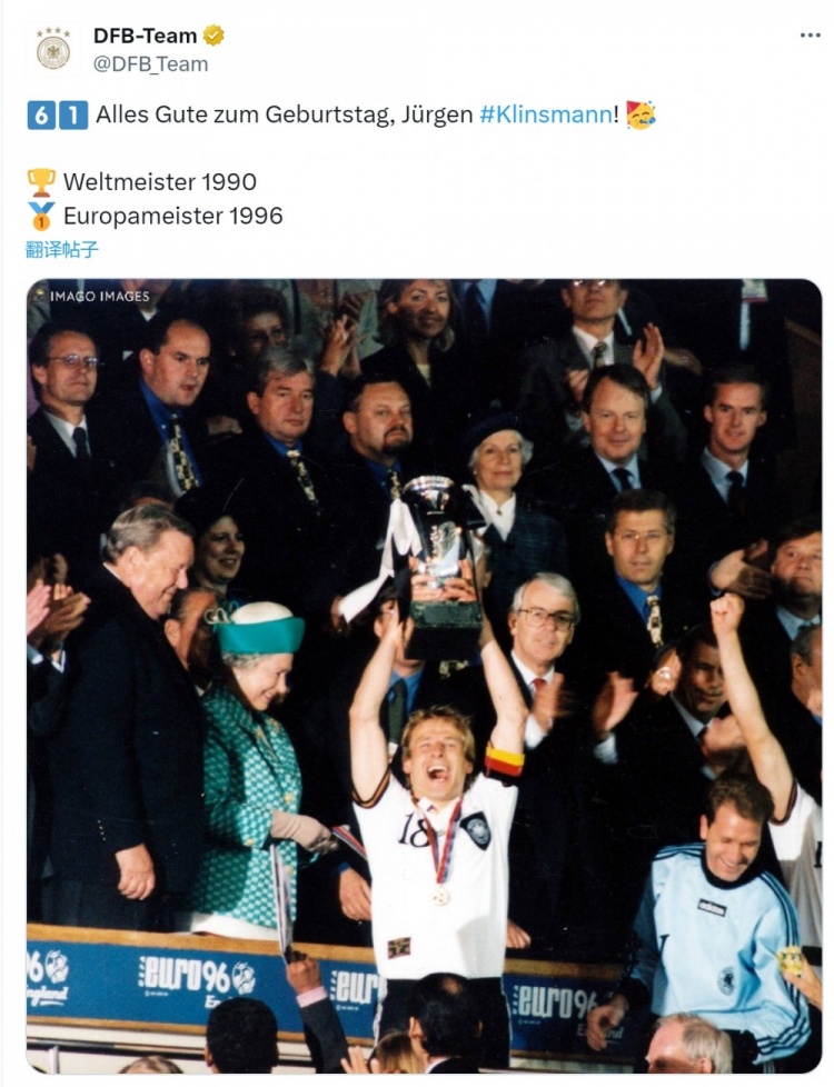 德国队社媒克林斯曼捧杯的像片,配文:“祝克林斯曼61岁寿辰舒心,1990年寰宇杯冠军、1996年欧洲杯冠军!”