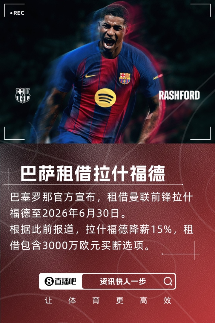 官方音信,巴萨从曼联租赁27岁时尚拉什福德,租期至2026年6月30日,来往附带买断选项,拉什福德将穿巴萨14号球衣。
