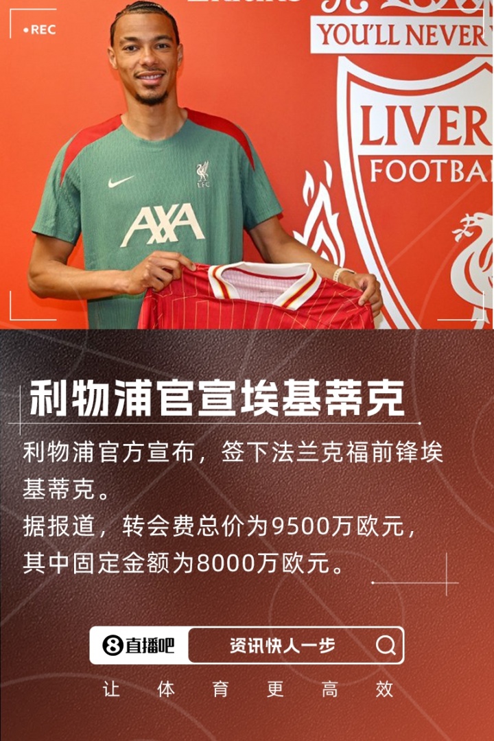 官方音信,利物浦签下23岁时尚埃基蒂克。据此前罗马诺报说念,转会费总价为9500万欧元,具体结构为8000万固定+1000万浮动,另有500万难以达到的条件。