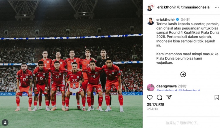 赛后印尼足协主席托希尔在社媒谈到了印尼队的施展,他写谈: