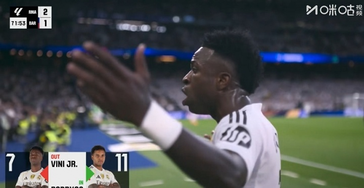 10月27日讯 西甲第10轮西班牙国度德比,皇马主场迎战巴萨,第72分钟,维尼修斯被换下,一说念喋喋陆续,下场直接回更衣室。皇马换上罗德里戈。