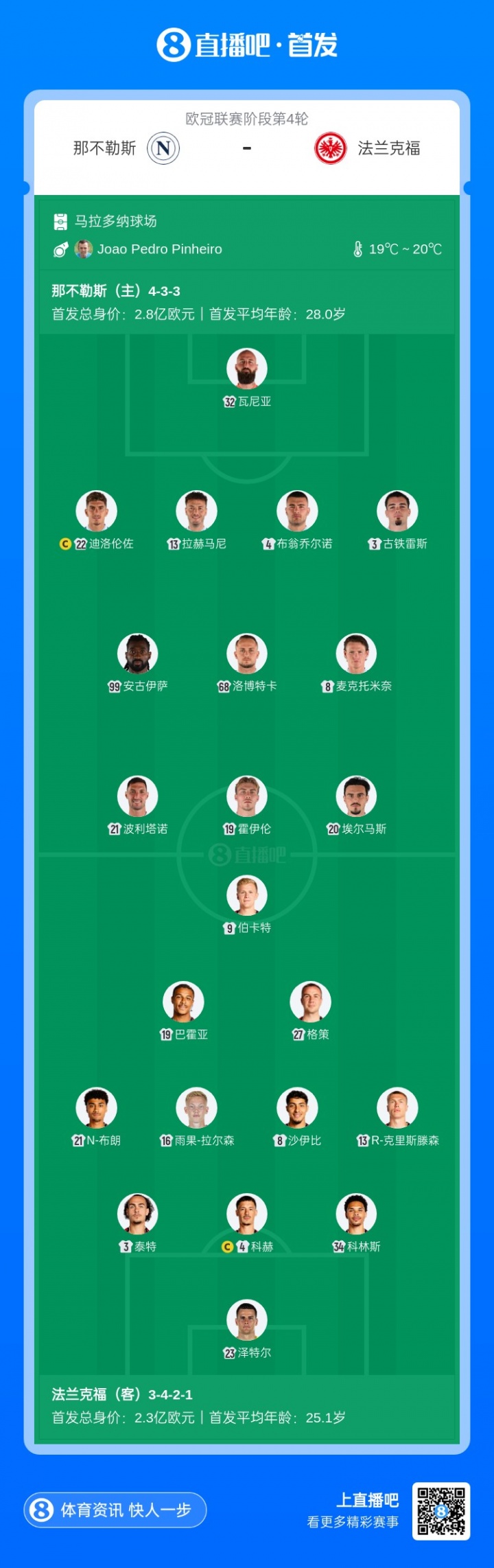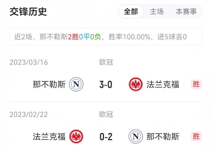 本场比赛前,那不勒斯与法兰克福均3轮1胜2负,积3分;分裂排行欧冠第23、22,法兰克福因净胜球上风高1名。两边前次交锋要追忆到2023年的欧冠,那不勒斯3-0慑服法兰克福。