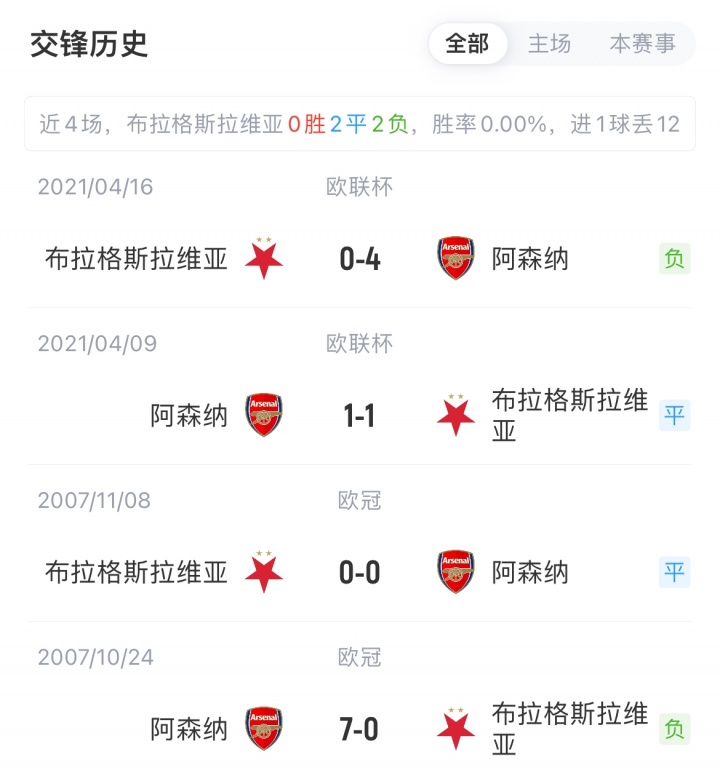 阿森纳对阵布拉格斯拉维亚已4场不败(2胜2平)。