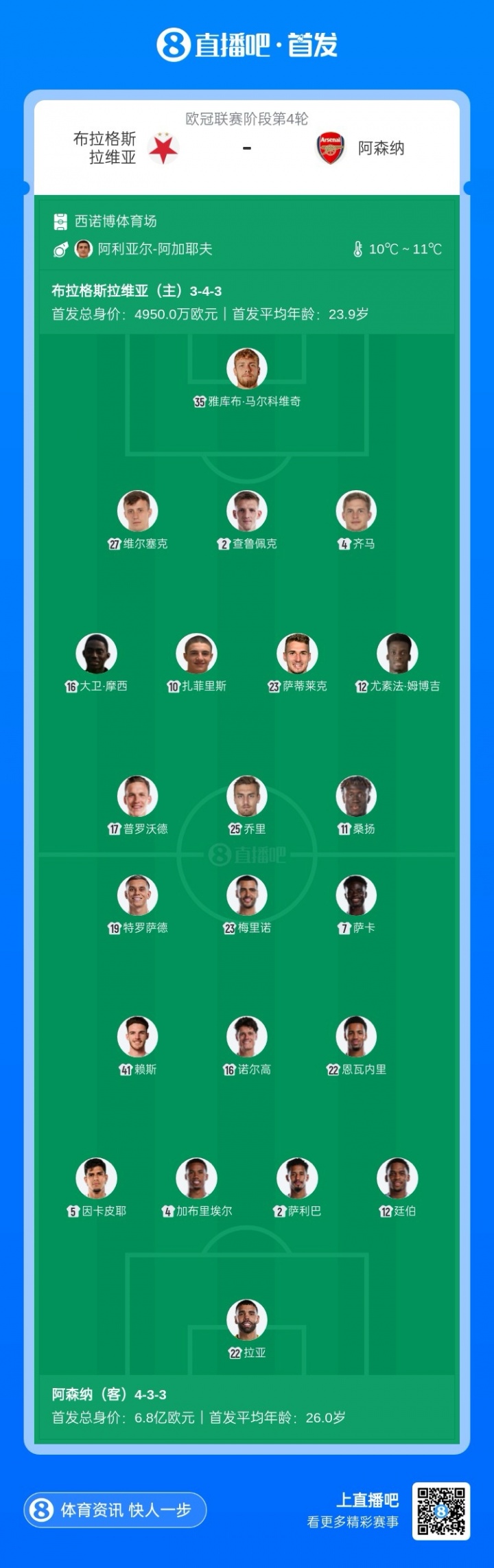 布拉格斯拉维亚首发:35-雅库布·马尔科维奇、27-弗尔切克、2-查鲁佩克、4-皆马、16-大卫·摩西、10-扎菲里斯、23-萨蒂莱克、12-尤素法·姆博吉、17-普罗沃德、25-乔里、11-桑扬