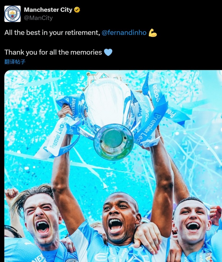 曼城官方晒出了费尔南迪尼奥手捧英超冠军奖杯的相片,并配文:“道贺你在退役后一切告成!@费尔南迪尼奥。感谢你曾带给咱们的统统回忆。”