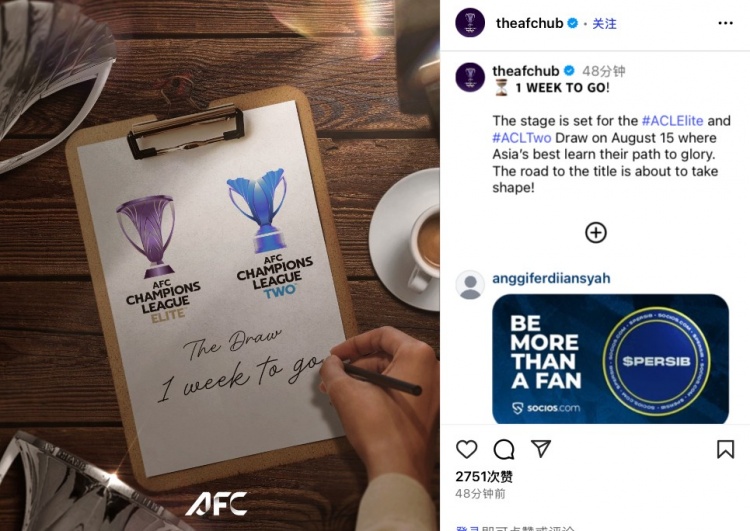 亚足联官媒配文写谈:“距离抽签典礼还有一周!亚冠精英联赛和二级联赛抽签将在8月15日举行,舞台仍是准备好了,通往冠军之路行将成行!”
