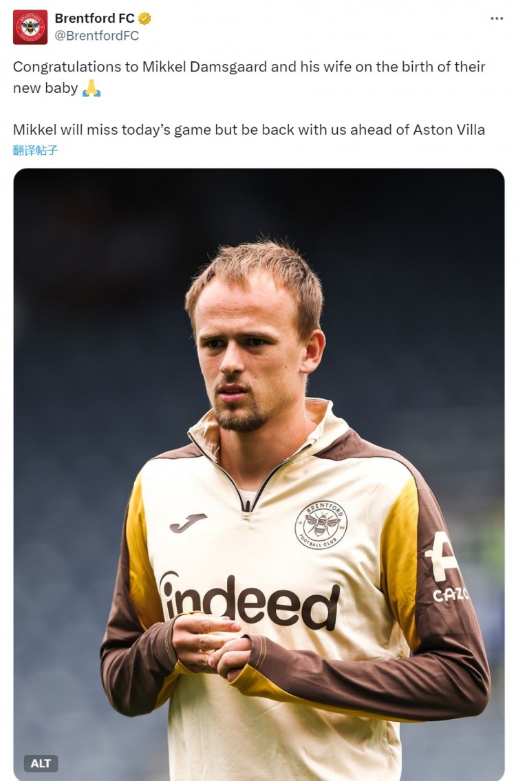 布伦特福德对达姆斯高默示祝愿,球员将在对阵维拉的比赛之前追溯球队。