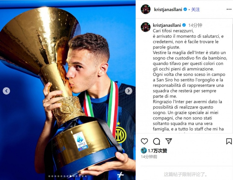 阿斯拉尼社媒写说念:“亲爱的国米球迷们,当今是向大家告别的工夫了,服气我,找到稳当的言辞真的扼制易。穿上国米的球衣是我儿时怀揣的梦念念,当时我怀着满心的珍爱为国米球员们加油。