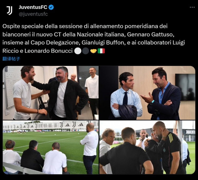 意大利新帅加图索及领队布冯、助教博努奇和里奇奥在本日下昼访谒了尤文磨真金不怕火基地,和俱乐部高下进行了友好相通。