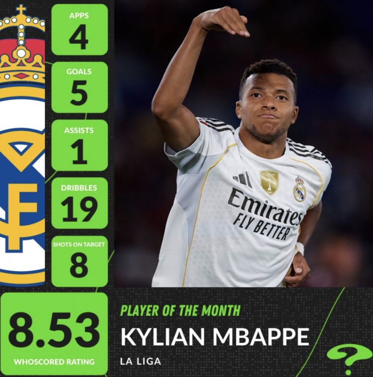 姆巴佩在9月的4场西甲打进5球,助攻1次。时辰完成19次告捷过东说念主,8次射正概念。Whoscored评分达到了8.53分。