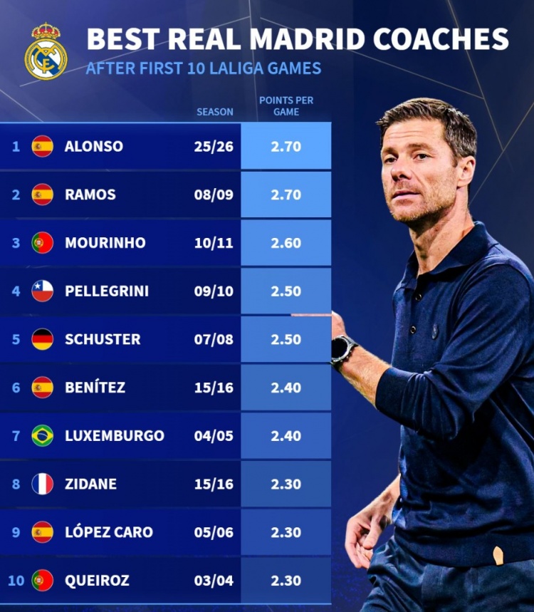 10月27日讯 皇马在本轮西甲焦点战2-1力克巴萨,阿隆索带队接续了出色的战绩。德转数据统计透露,阿隆索合手教皇马的前10轮西甲拿分并排历史第一。