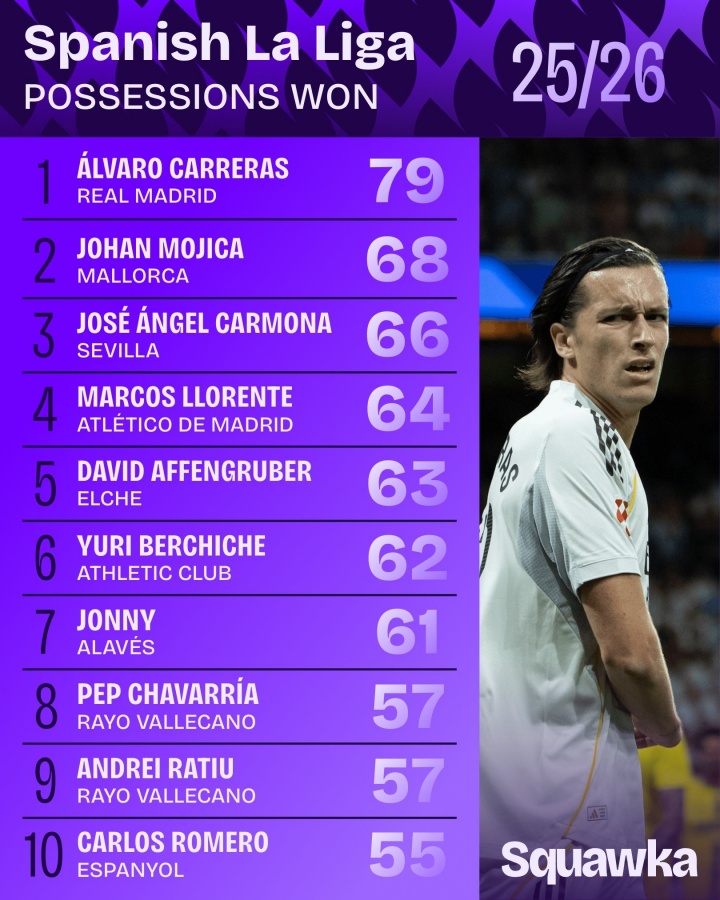 以下为本赛季西甲球员夺回球权次数名次榜: