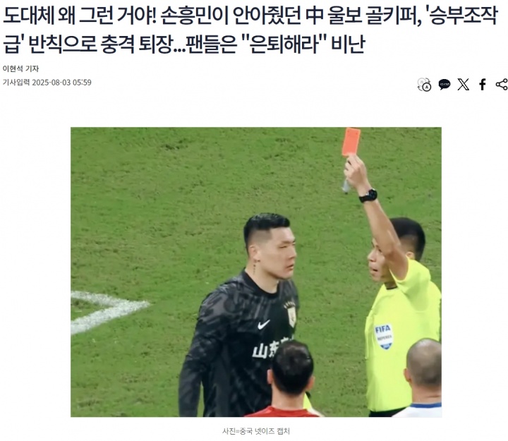 昨日的中超第19轮,成齐蓉城2-1山东泰山,王大雷下半场被红牌罚下激励热议,韩媒Sports Chosun也温存到了这次事件。并撰文报谈,标题为《这究竟是怎么回事?孙兴慜也曾拥抱过的中国门将,却因一次可能被认定为假球的犯规被罚下场……球迷们历害报复他,条款他退役》
