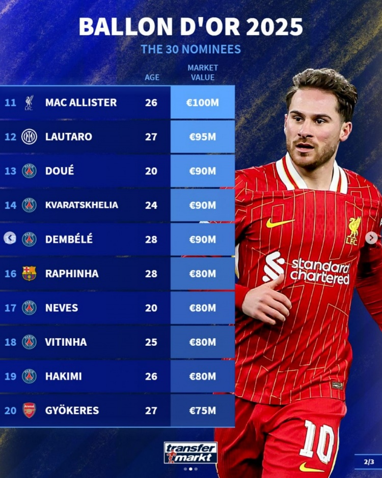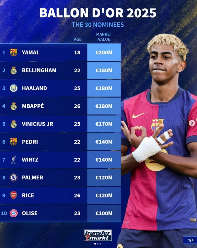 8月7日讯 金球奖30东说念主候选名单公布,德转也盘货了30东说念主身价榜单,其中亚马尔2亿欧居首,具体如下(身价换取年岁小者在先):