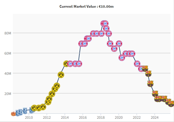 莱万的身价曾在2018年遵守拜仁技能达到巅峰的9000万欧。